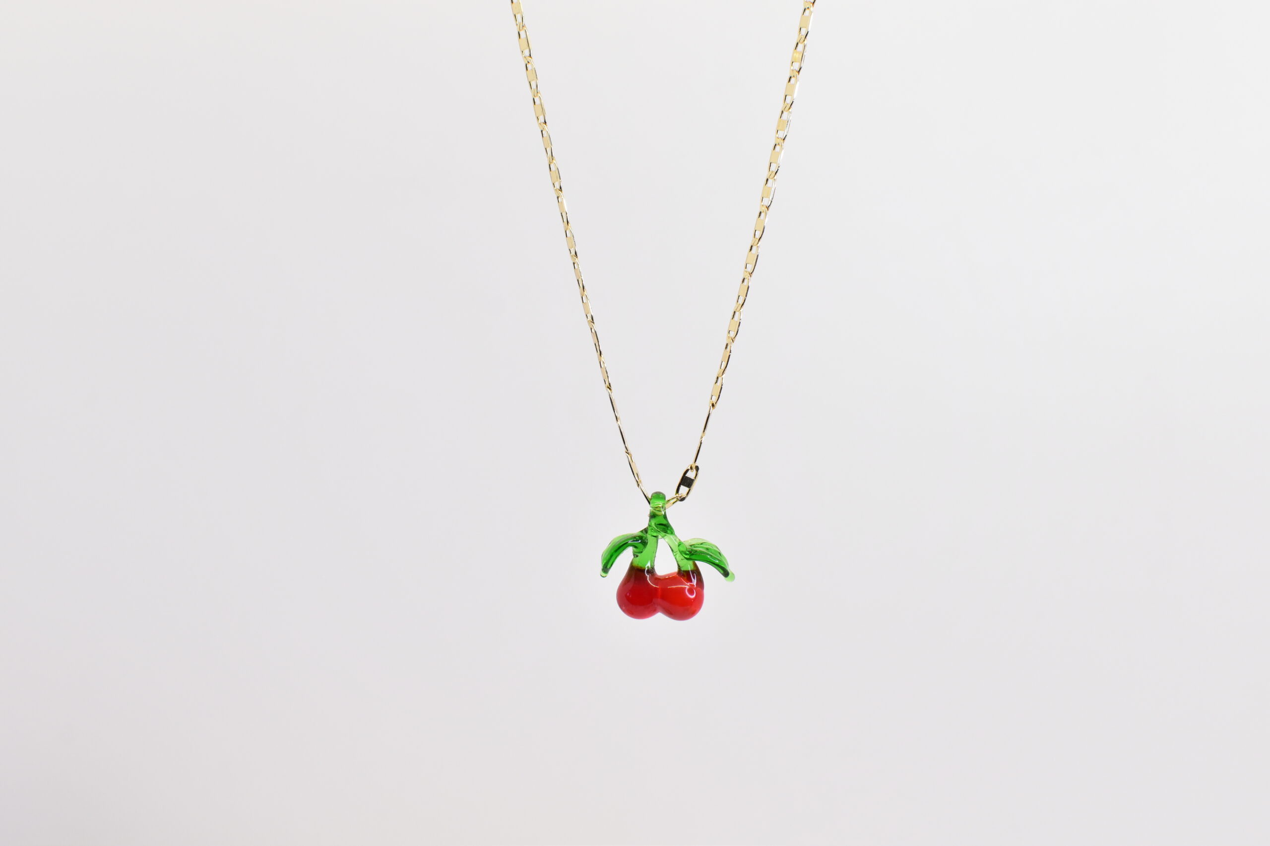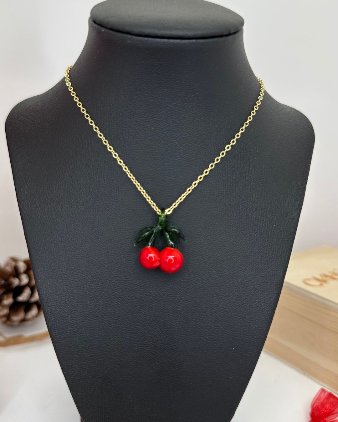 Collar dorado con cadena fina y dije de dos cerezas rojas esmaltadas con hojas verdes, ideal para quienes aman los accesorios con un toque divertido y frutal. Perfecto para usar a diario, combinar con looks casuales y darle un toque de color y frescura a cualquier outfit.
