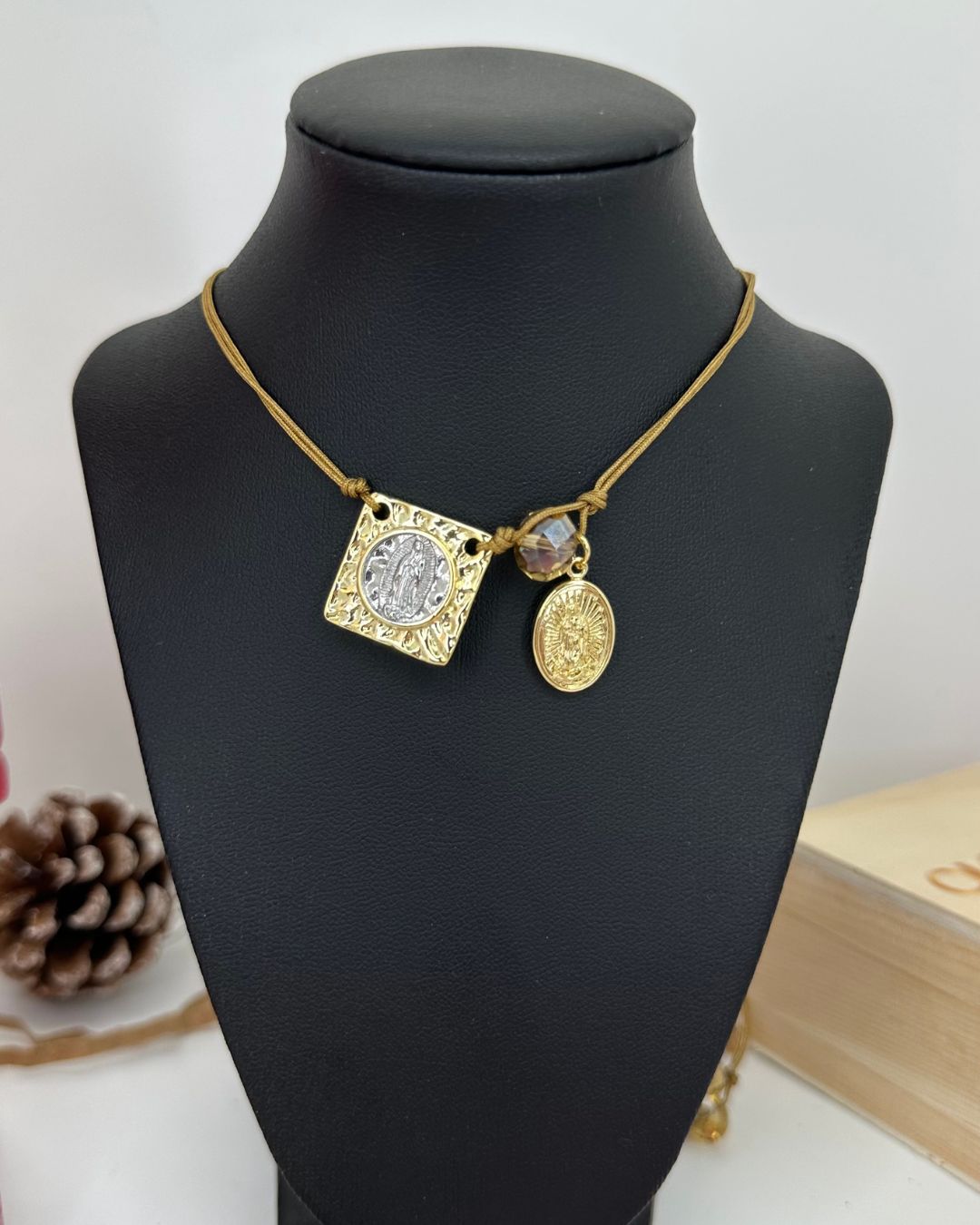 Collar con cordón camel ajustable y dos medallas religiosas doradas, una cuadrada bicolor con relieve central y otra redonda, acompañadas de un cristal facetado en tono humo. Ideal para un estilo boho y espiritual, perfecto para usar a diario o combinar en capas con otros collares dorados para un look más llamativo.