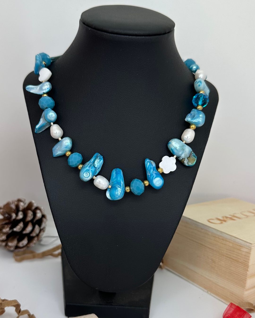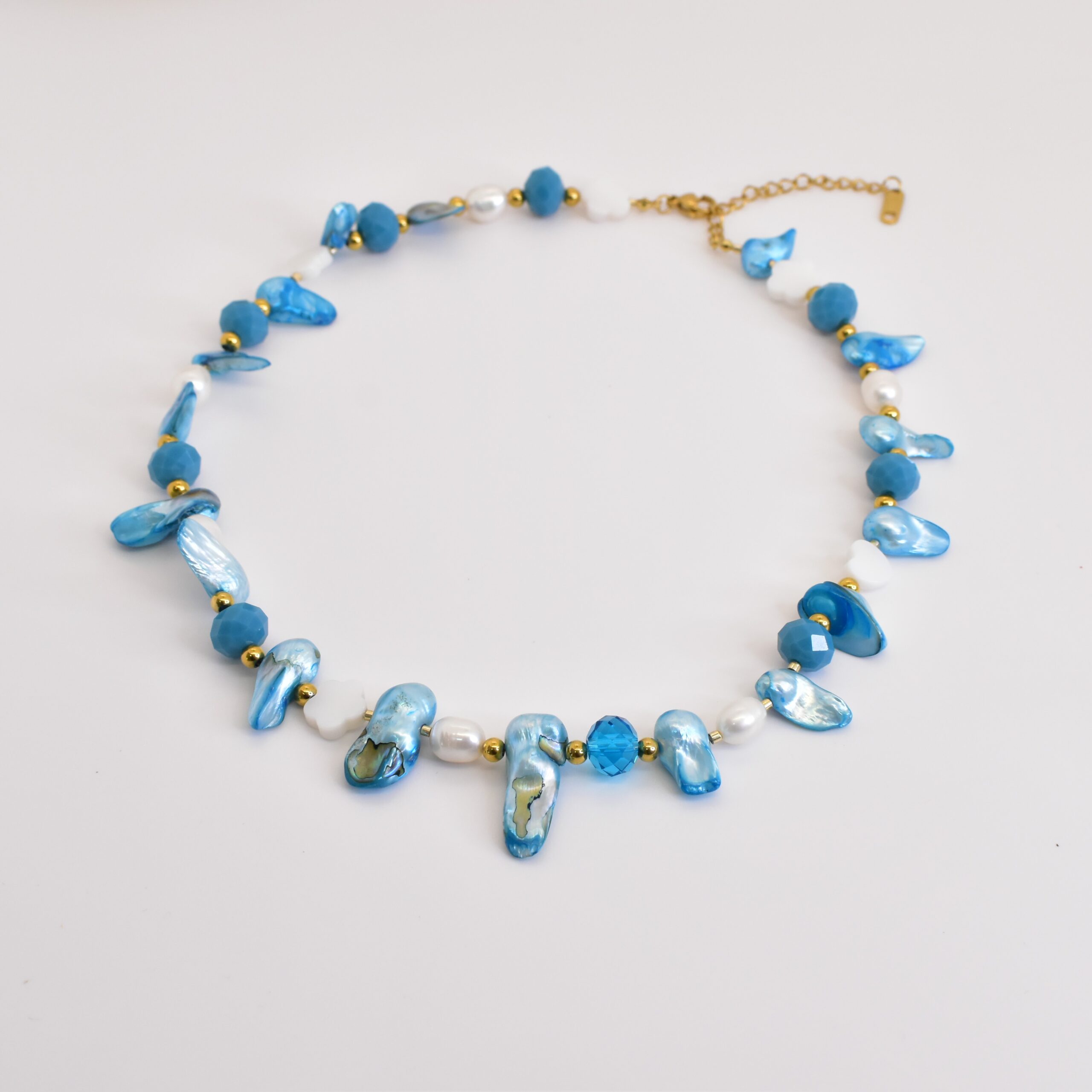 Collar hecho a mano con perlas de río blancas y piezas irregulares en tonos azules, combinadas con cristales y detalles dorados que aportan brillo y profundidad. Ideal para quienes aman los accesorios únicos inspirados en el mar, perfecto para elevar looks neutros y usar tanto de día como de noche.