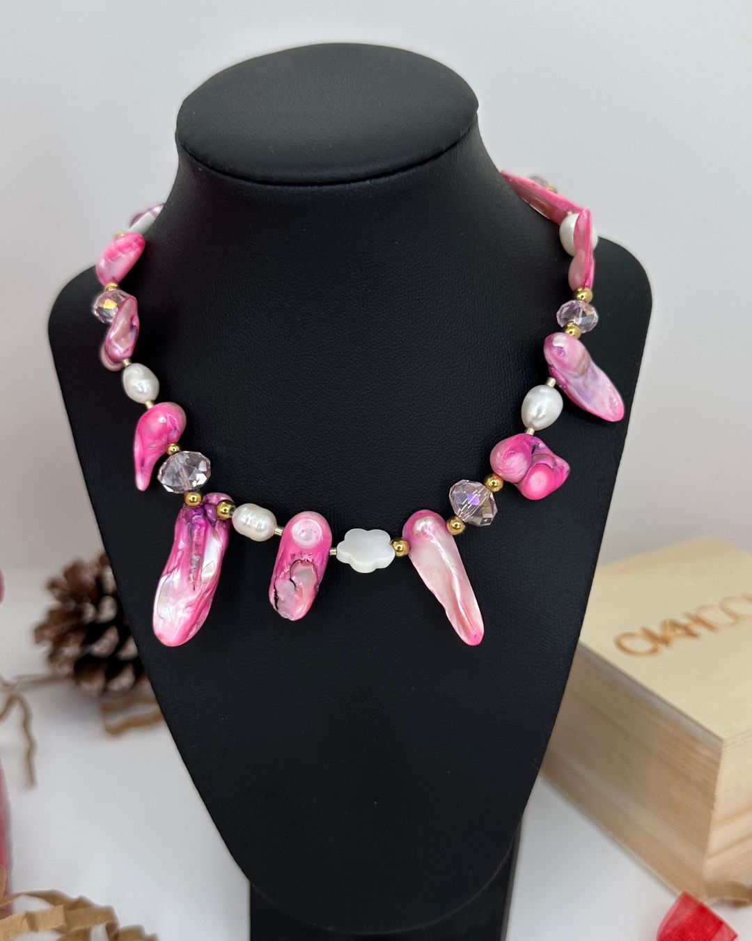 Collar hecho a mano con perlas de río naturales en tonos blancos y rosas, combinado con piezas irregulares en fucsia y cristales que aportan brillo y movimiento. Ideal para quienes buscan un accesorio único y llamativo, perfecto para levantar looks básicos y usar en ocasiones especiales.