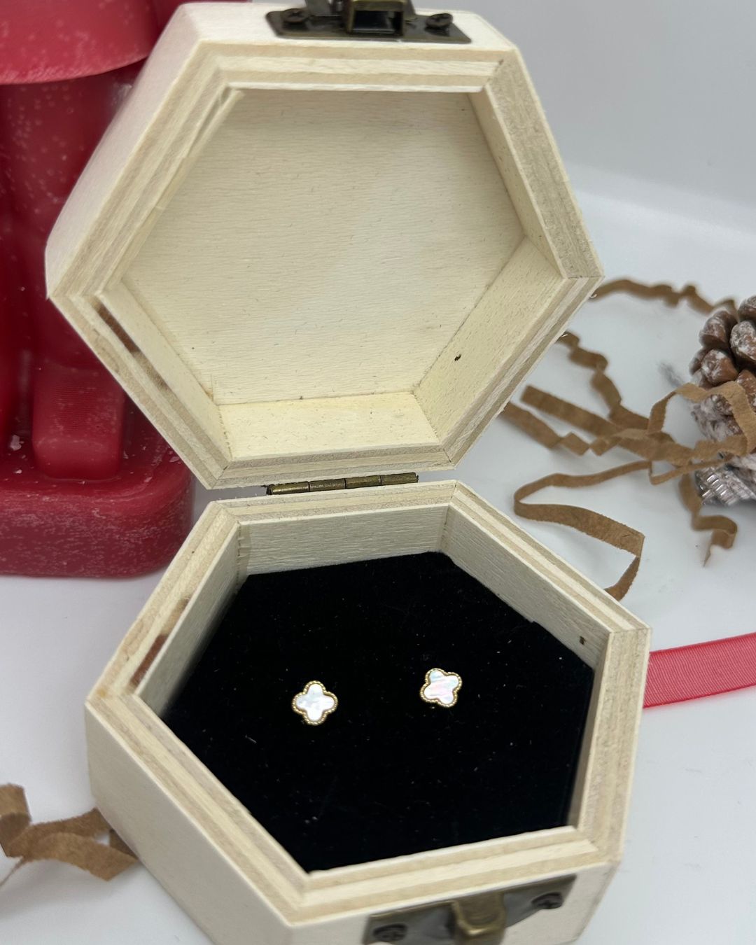 Aritos pequeños en forma de trébol de cuatro hojas en tono dorado con centro blanco nacarado, ideales para un look delicado y femenino. Perfectos para uso diario o para combinar con otros accesorios y darle un toque de luz discreta a tus outfits.