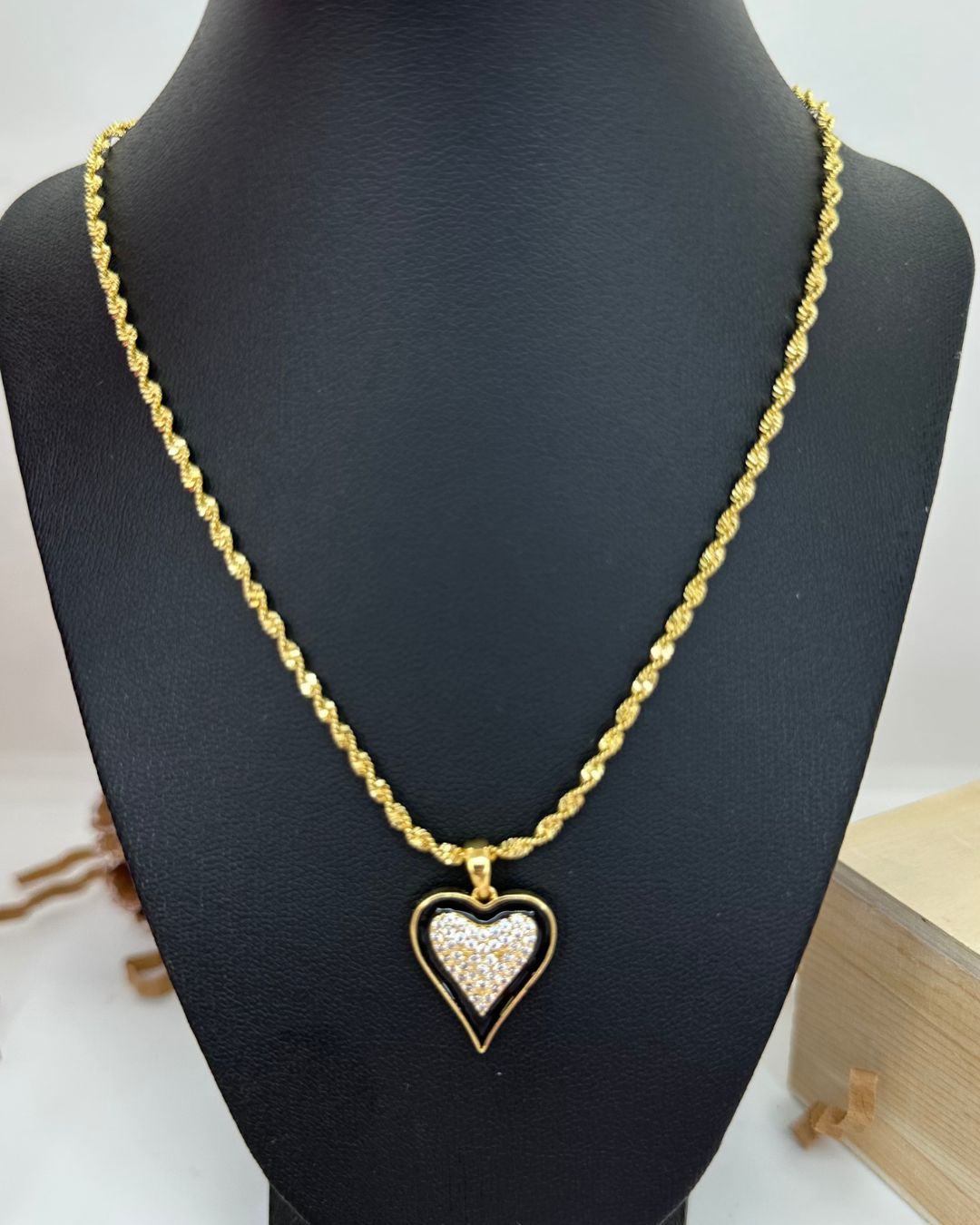 Collar dorado con cadena trenzada y colgante de corazón contorneado en dorado, relleno de pequeñas piedras brillantes que aportan un efecto luminoso y elegante. Ideal para lucir como pieza protagonista en ocasiones especiales o para elevar un look básico con un toque romántico y sofisticado.